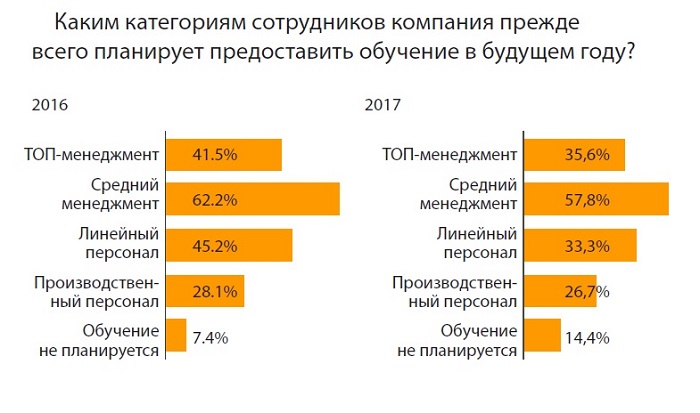Особое внимание в 2018 году компании (58% опрошенных) планируют уделить обучению менеджеров среднего звена.