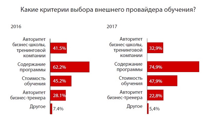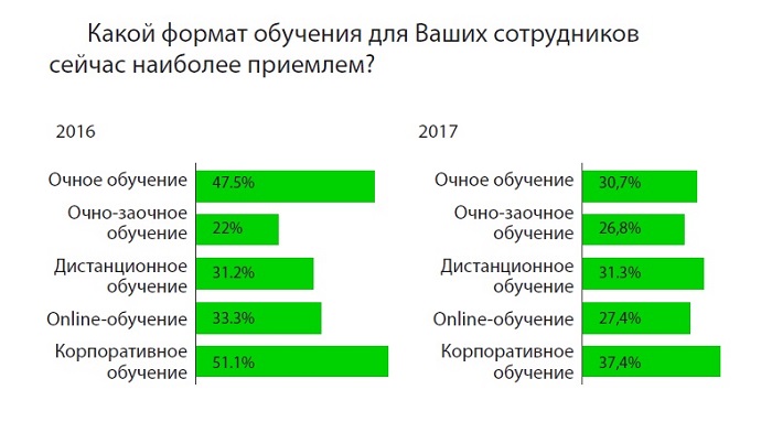 Бюджеты на обучение в 53% случаев остались на прежнем уровне, 21% опрошенных отмечают увеличение бюджетов (против 17% в 2016 году), 17% – уменьшение бюджетов (против 24% в 2016 году). При этом увеличилось число закрытых бюджетов: 15% респондентов отмечают, что их компании не планируют затраты на обучение сотрудников (против 5% в 2016 году).