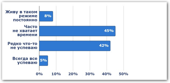 В ходе исследования выяснилось,что 53% россиян жалуются на хроническую нехватку времени для решения рабочих задач: 8% из них постоянно живут в режиме цейтнота и ничего не успевают, 45% часто не укладываются в сроки. При этом 42% сотрудников компаний сообщили, что редко что-то не успевают, и лишь 5% заявили, что всегда выполняют рабочие задачи вовремя.